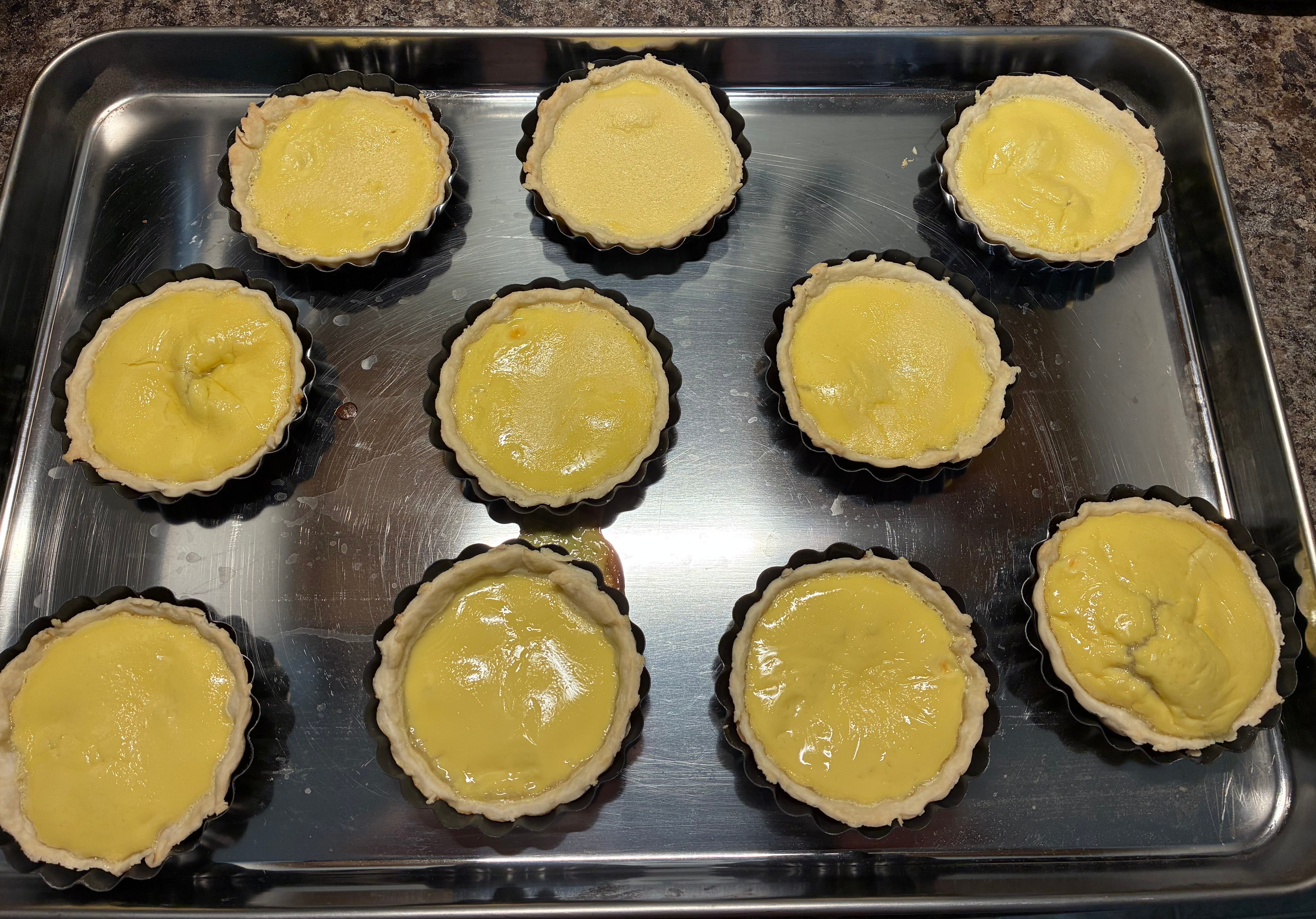 Place your chilled tart pans on a sheet pan. Divide the custard between them evenly. About 2T per pan.