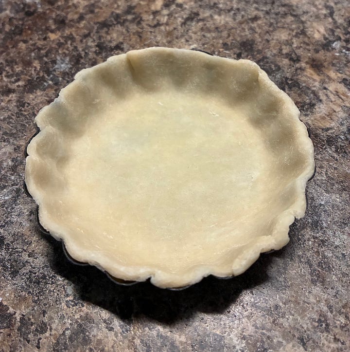 Work the butter into your flour/salt mixture until you have the consistency of bread crumbs. Add 3T of the water and mix until your dough comes together into a rough mass. Use the rest of the water if needed.
